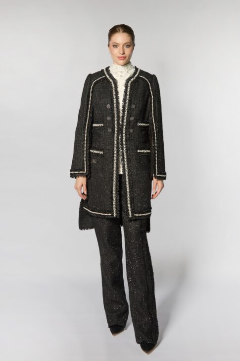 Кардиган из твида с люрексом, на шелковом подкладе. Вся тесьма на изделии выполнена вручную.