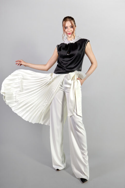 Классические брюки из ткани "Дубайский шелк", дополненные отдельной съемной накидкой, выполненной в технике ручное гофре, на широком поясе с вышитым логотипом.