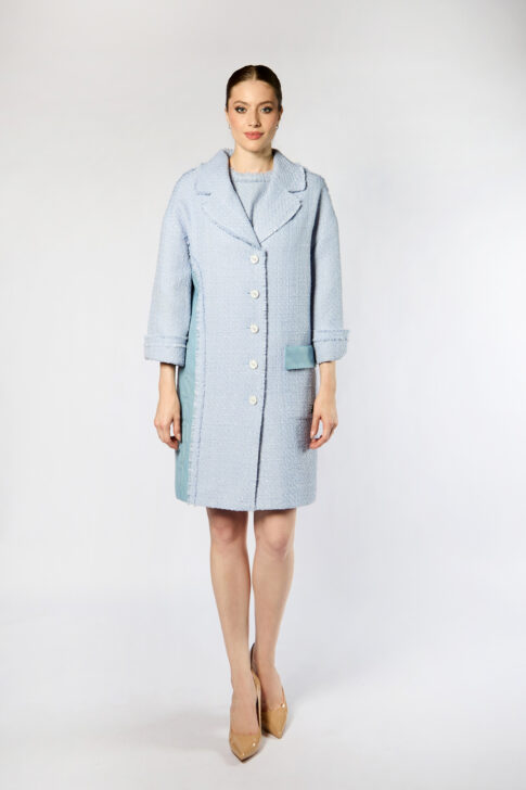 Платье из твида с люрексной нитью. Декор в виде вставки из кожаного трикотажа с логотипом бренда. Вся декоративная тесьма на изделии выполненная вручную.