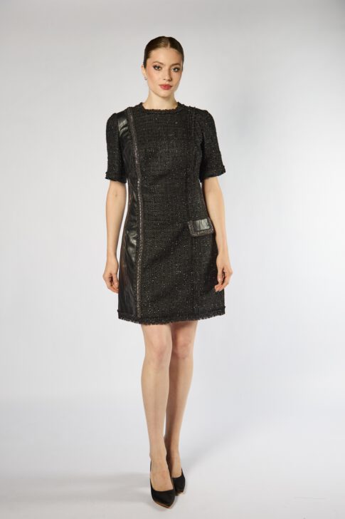 Пальто из твида с люрексной нитью. Декор в виде вставки из кожаного трикотажа с логотипом бренда. Вся декоративная тесьма на изделии выполненная вручную.