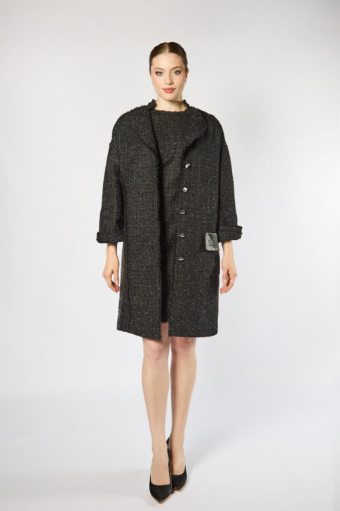 Платье из твида с люрексной нитью. Декор в виде вставки из кожаного трикотажа с логотипом бренда. Вся декоративная тесьма на изделии выполненная вручную.