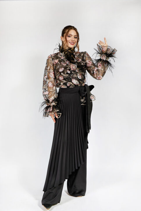 Классические брюки из ткани "Дубайский шелк", дополненные отдельной съемной накидкой, выполненной в технике ручное гофре, на широком поясе с вышитым логотипом.