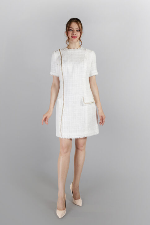 Пальто из твида с люрексной нитью. Декор в виде вставки из кожаного трикотажа с логотипом бренда. Вся декоративная тесьма на изделии выполненная вручную.