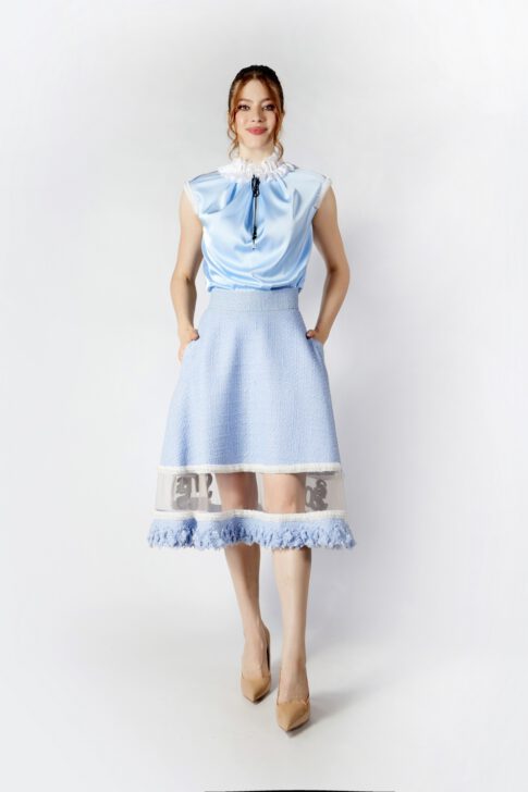 Костюм из твида с люксовой нитью на шелковом подкладе. Отделка прозрачной вставкой на юбке: шелковая сетка с логотипом из бархата, ручная работа. Вся тесьма на изделии выполнена  вручную. Костюм может быть продан по отдельности.
