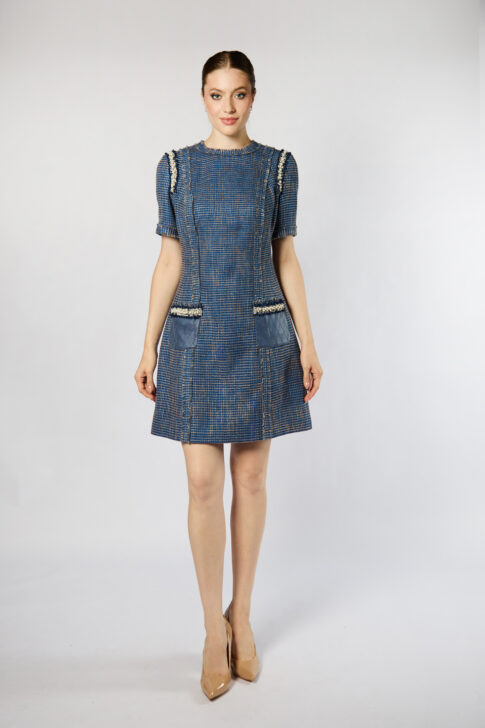 Пальто из твида с люрексной нитью. Декор в виде вставки из кожаного трикотажа с логотипом бренда. Вся декоративная тесьма на изделии выполненная вручную.