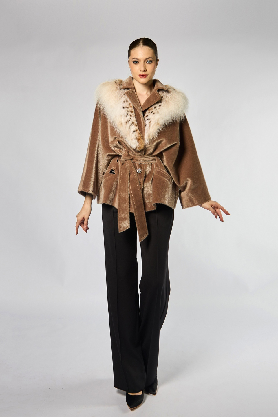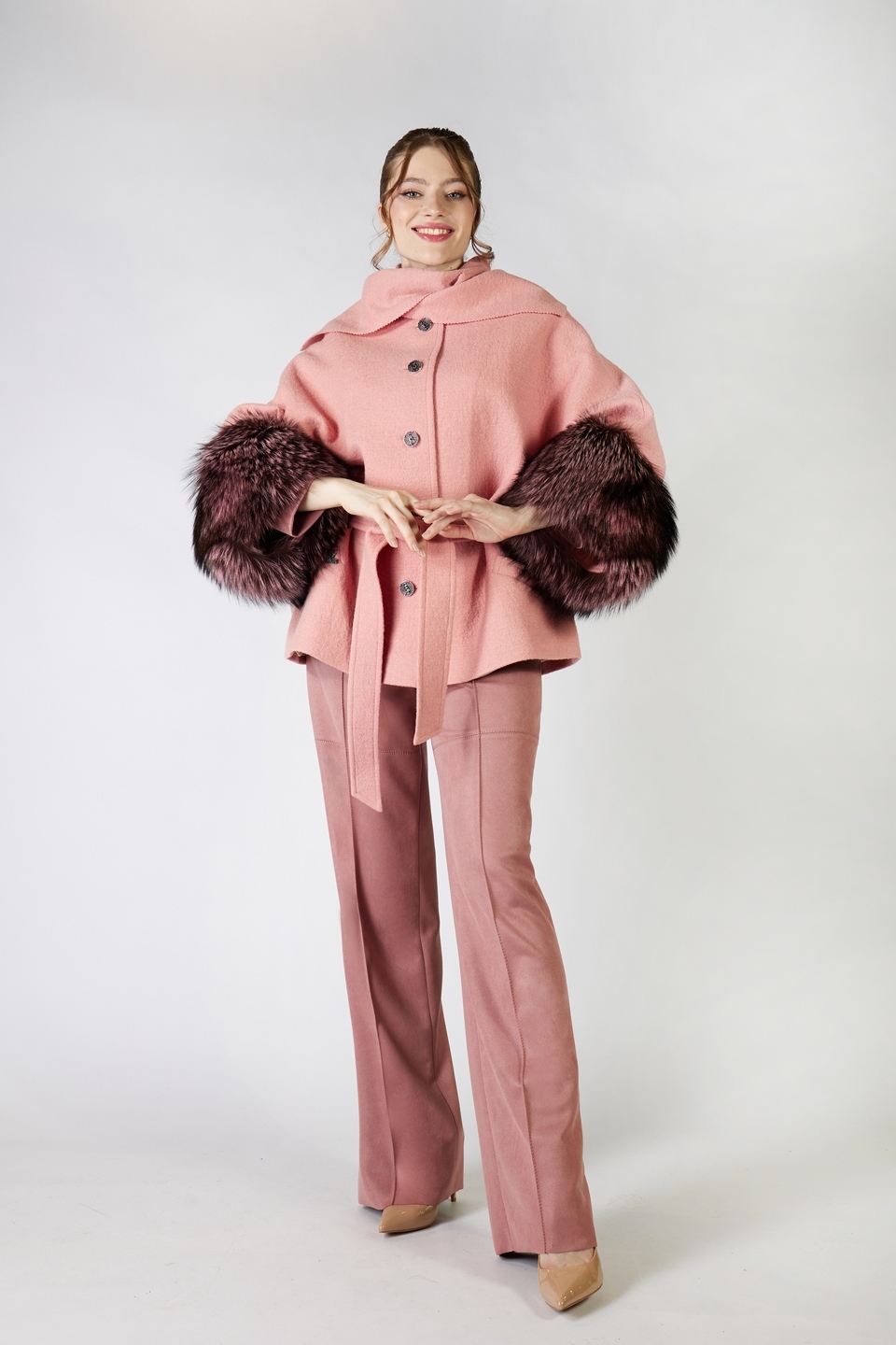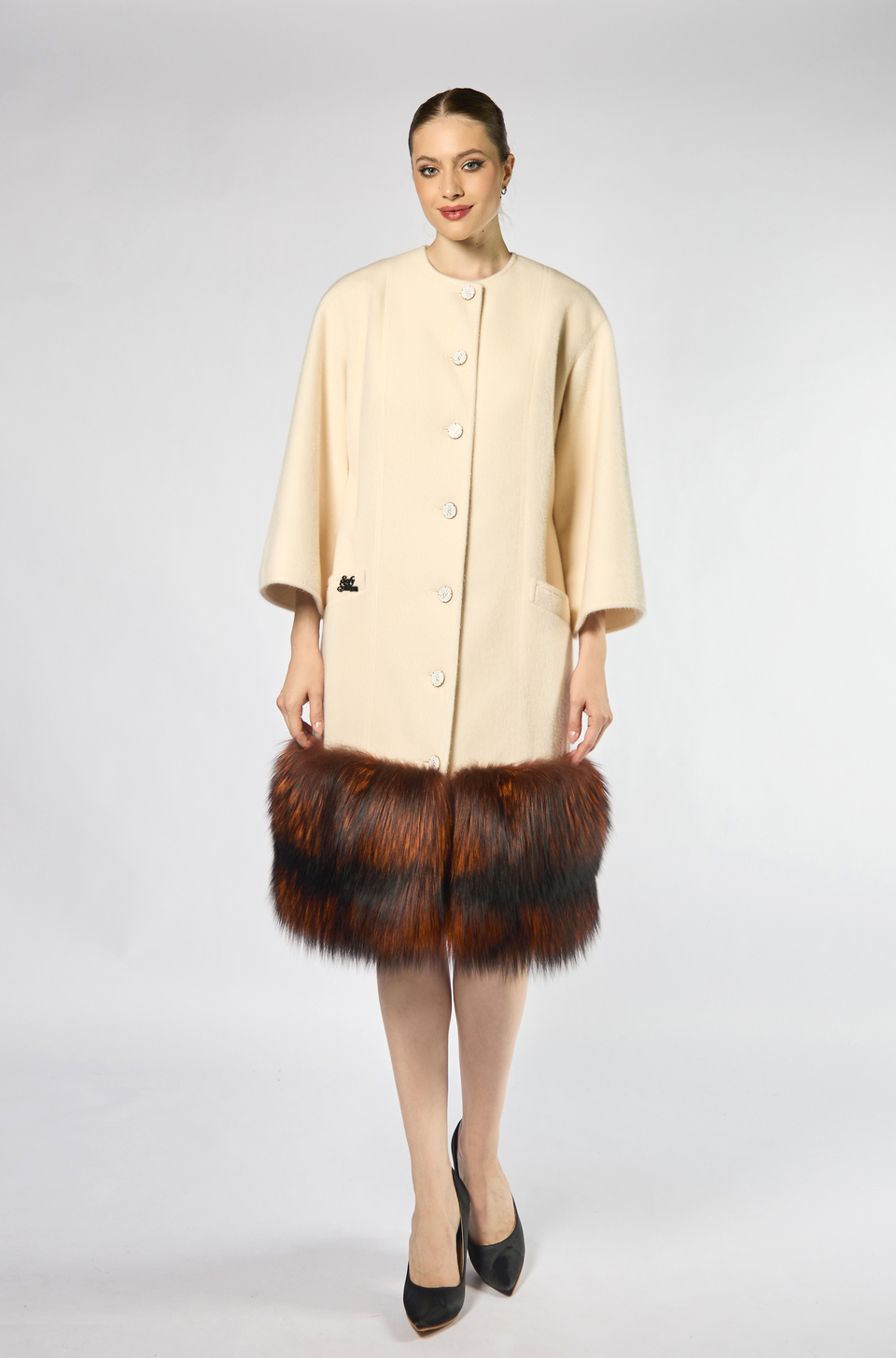 Пальто из белой скандинавской норки-велюр. Подклад: эксклюзивное кружевное полотно, тканное по размеру изделия, без единого шва.