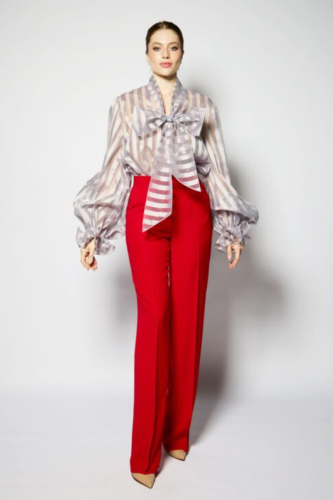 Воздушность шелковой органзы играет на контрасте полупрозрачных и плотных полос. Элегантность серого оттенка + уникальность отделки = идеальный баланс для романтичного и стильного образа.