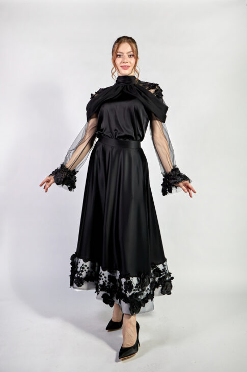 Шелк. Плечи и манжет декорированные шелковыми цветами ручной работы.
