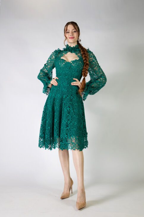 Пальто из меха скандинавской норки-велюр, украшенное тканным кружевом. Цвет изделия «Изумруд»