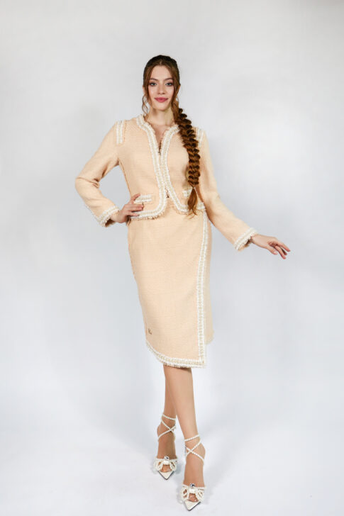 Кардиган из твида с люрексом, на шелковом подкладе. Вся тесьма на изделии выполнена вручную.